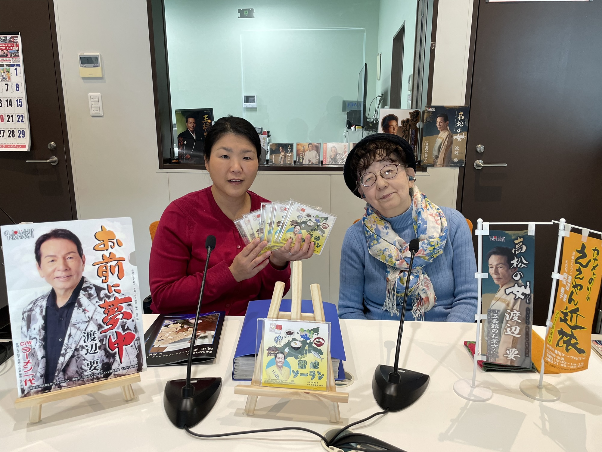 昨年7月10日にお亡くなりになった渡辺要さん。30年以上ともにささえて頑張ってきたマネージャーの岩鍋希光子さん。讃岐ソーランを、製品化した思い、また、今後、これまでをお聞きしました。マネージャーとしてささえてきたからマイクの前では緊張する、、といっていたのは最初だけ、、でした。